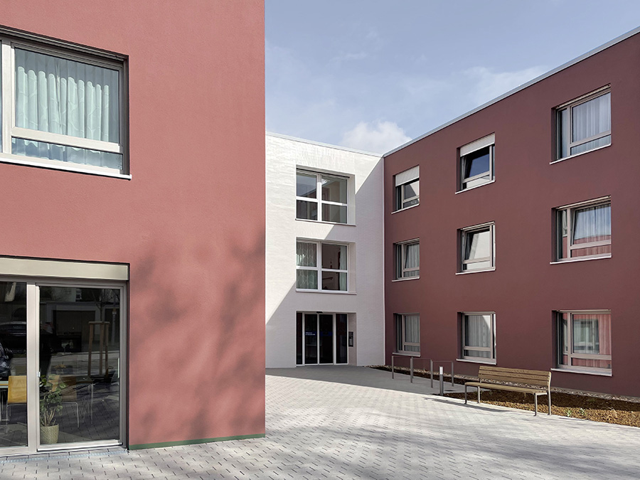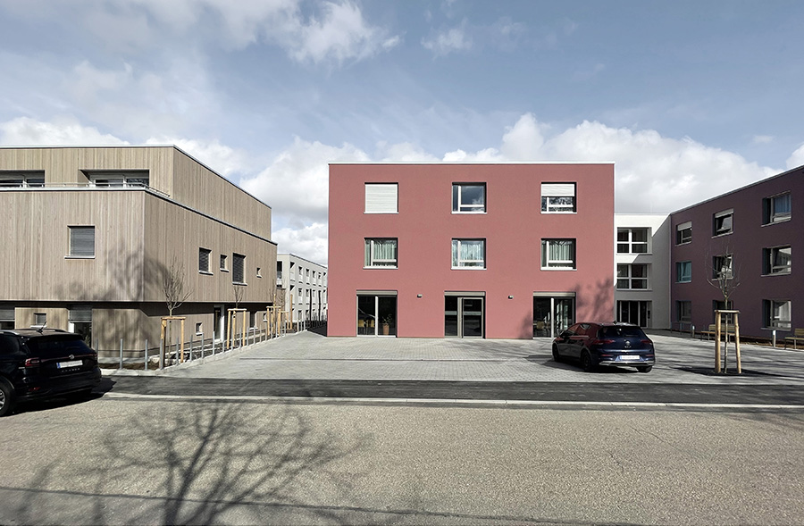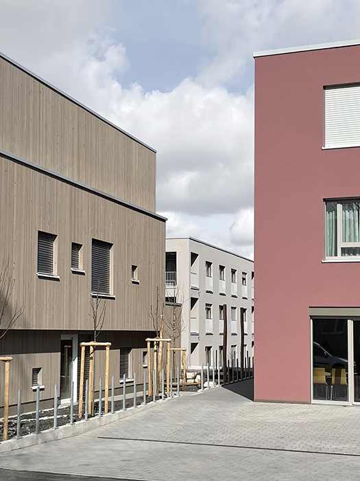 Das Quartier kombiniert die Nutzungen Kindertagesstätte, Junges Wohnen, Betreutes Wohnen und Pflege in unmittelbarer Nachbarschaft. Die Nutzergruppen sind den drei in ihrem architektonischen Ausdruck sehr verschiedenen Gebäuden zugeordnet. Der Eindruck einer zusammenhängenden Gebäudeanlage wird vermieden. Vielmehr können die Gebäude als Ortsbausteine verstanden werden, die durch ihre Verschiedenheit in Beziehung treten. Der Dialog der Generationen in der Bewohnerschaft soll so abgebildet und befördert werden. 7.600 qm Bgf Kindertagesstätte, 3 Gruppen, 5 Wohneinheiten Betreutes Wohnen, 12 Wohneinheiten Pflegehaus, 45 Zimmer, 17 Wohneinheiten