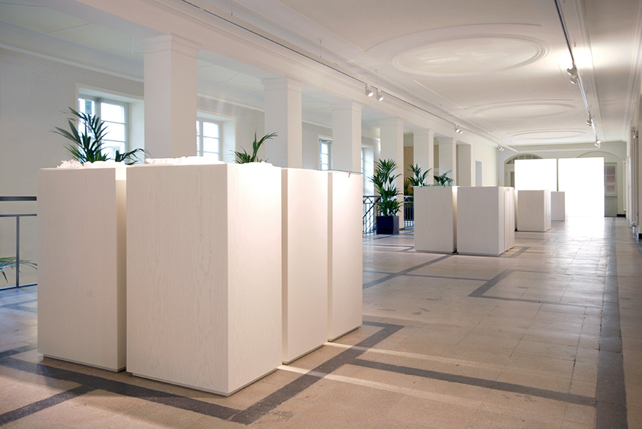 Display Ausstellungsgestaltung Entwurf einer Kollektion von Displayobjekten für wechselnde Ausstellungen. Die Objekte verstehen sich als mobil gewordene Verwandtschaft der Wandreliefs und fügen sich in die grafischen Ordnung von Decken- und Bodenfeldern ein. 24 Sockelobjekte und 4 Wanddisplays
