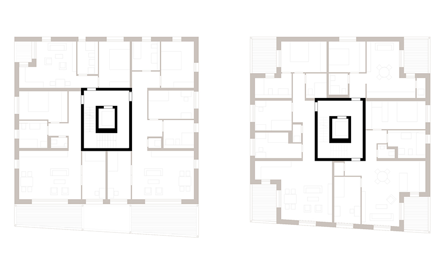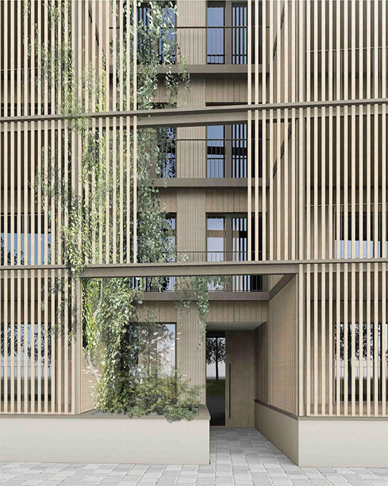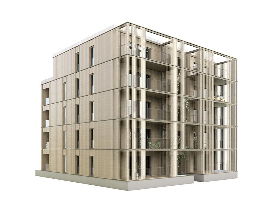 An der Promenade am Rand des geplanten BUGA Geländes entstehen zwei Wohnhäuser. Sie sind Teil eines Modellquartiers auf der Fläche der ehemaligen Spinelli Barracks. Die Häuser haben eine kompakte Kubatur und fügen sich in offener Bauweise in die Hauszeile an der Promenade ein. Die architektonische Erscheinung soll Verschiedenheit und Verwandschaft der beiden benachbarten Bauten zum Ausdruck bringen. Die Fügung der Loggienräume an den Hauptbaukörper, Rastermaße in der Holzverschalung, Material- und Farbwahl erzeugen die Verschiedenheit. Sockel, Dachabschluss und grundsätzliche Proportionsverhältnisse in der Fassade sind zueinander verwandt. Die hybride Bauweise ist Ergebnis eines intensiv geführten Planungsprozesses mit allen beteiligten Disziplinen. Die Mischkonstruktion aus Holz, Beton und Ausbauteilen wurde hinsichtlich Co2 Bilanz und Ökonomie genau austariert. 4.600 m² Bgf, 28 Wohneinheiten Wettbewerb 1.Preis, Baubeginn 2023