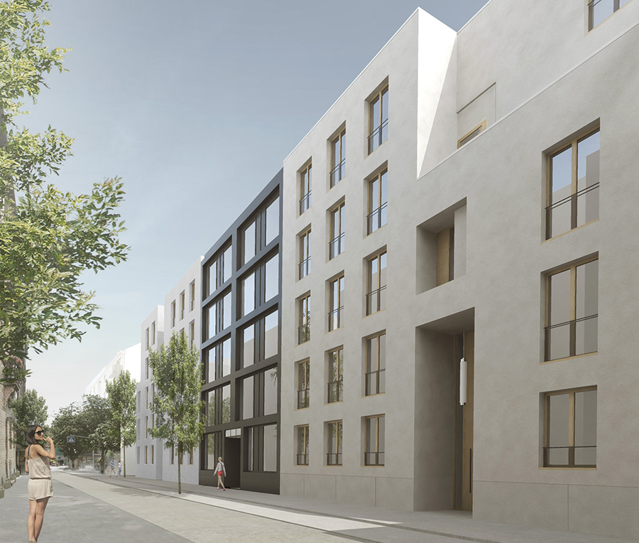 Die Gestaltung eines vollständigen städtischen Blocks im Rahmen einer singulären Baumaßnahme stellt eine besondere konzeptionelle Herausforderung dar. Diese besteht darin, das historisch gewachsene Leitbild der Stadt im Sinne einer komplexen Collage aus baulichen Strukturen, Nutzungen, Stilen und materieller Alterung fortzuschreiben. Dabei bilden die überlieferten städtebaulichen Regeln (Parzellierung, Traufhöhen, Baulinien etc) nur den äußeren Rahmen für eine Neuinterpretation dieser Aufgabe, die durch schlichte Simulation des Bestehenden nicht glaubhaft zu lösen wäre. Der Block setzt sich aus einigen wenigen Gebäudetypen so zusammen, daß Hausabschnitte erkennbar sind. Es ergibt sich ein Grundrhythmus, der die Anlage in das städtische Umfeld einfügt und ein gutes Maß an Kleinteiligkeit aufweist. Der obere Abschluss der Bauten variiert im Bereich des 3. bis 5. Geschosses in der Weise, dass eine lebhafte Silhouette entsteht und die spezifische Physiognomie einzelner Bauwerke erkennbar wird. 18.000 m² Bgf, Wohnen und Gewerbe Wettbewerb