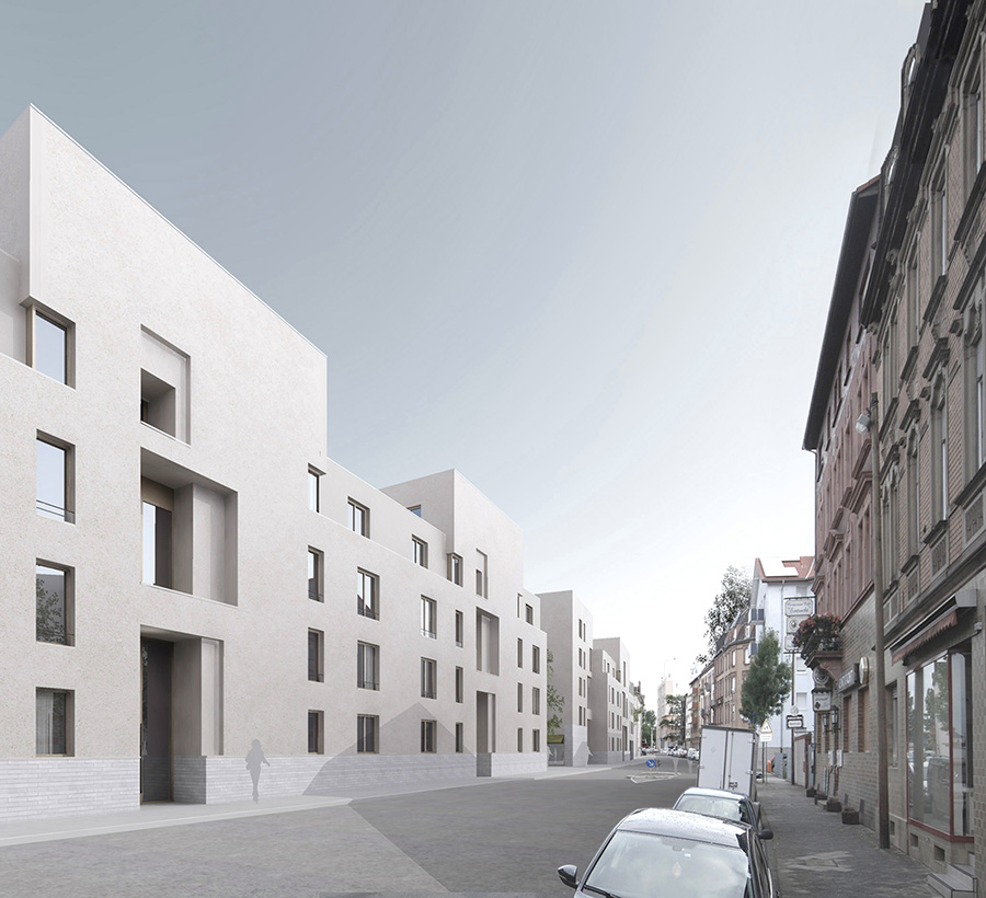 Die Fortführung der bestehenden Blockrandbebauung wird als ein Setzen von städtischen ´Häusern´ interpretiert, die als einzelne Adressen lesbar sind und die Baumasse entlang des Straßenverlaufs in maßstäbliche Segmente gliedern. Die Bauten bilden durch plastisch prägnante Eingangsbereiche und mittig aufstrebende Fassaden einen Rhythmus, der in der oberen Gebäude-Kontur durch die Staffelungen im vorletzten und letzten Geschoss ausformuliert wird. Die beiden thematischen Abschnitte ´Wohnen´ und ´Betreutes Wohnen´ sind dabei so gesetzt, dass der Durchgang zum rückwärtigen Park als Platzbereich aufgeweitet werden kann. Zum Park sind Wohnhöfe ausgebildet, die in ihrer kleinmaßstäblichen Ausprägung auch geschützte, halbprivate Außenräume mit entsprechenden Gartenanteilen ermöglichen. 11.000 m² Bgf, 86 Wohneinheiten