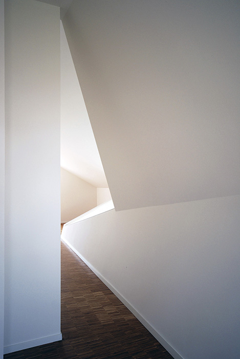 Wohnhaus für eine Person. Die geringe Größe des Hauses und die Kleinteiligkeit der umgebenden Siedlung führen zu einem Entwurf typologischer Eindeutigkeit. Das Haus fügt sich aus massivem Sockel, offenem Plan im Erdgeschoss und privat umschlossenem Raum im Obergeschoss. Die Ausbildung des Sockels ergibt sich in einem hochwassergefährdeten Gebiet aus dem Baurecht. Die Teilflächen des in der Außenerscheinung typischen Giebeldachs entfalten sich im Innern zu raumbildenden Polygonalflächen. 380 m² Bgf