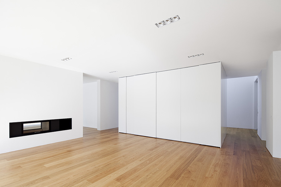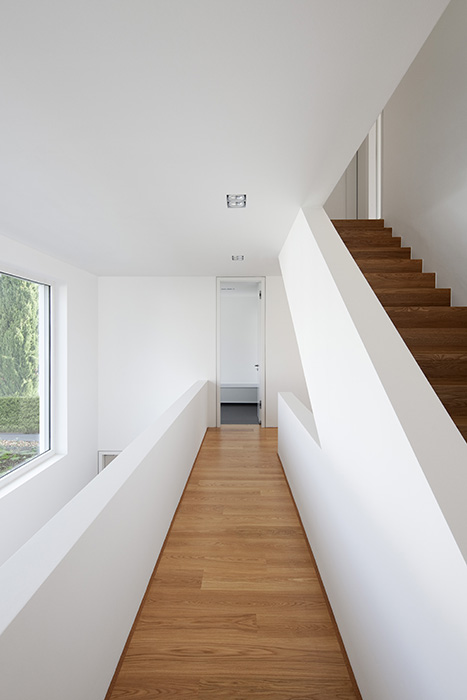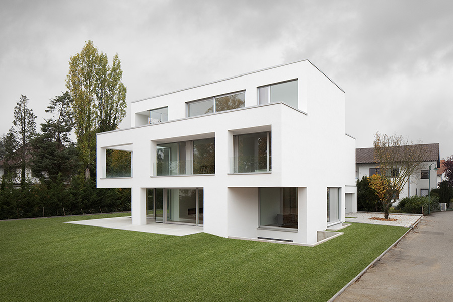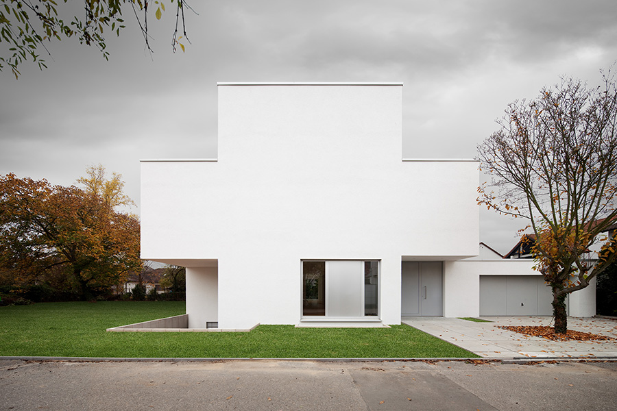 In einer Wohngegend mit homogener Bebauungsstruktur gelegen, konzentriert sich der Baukörper in Geometrie und Material auf sich selbst. Die Staffelung der Baumassen ereignet sich um die zentrale Eingangshalle. Die horizontale Verschiebung der Geschosse generiert den Wohnbereichen entsprechend Terrassen und Überdachungen. Dabei entsteht eine dem Ort und der Bestandsbebauung angemessene Gebäudesilhouette. Die großzügige horizontale Linienführung im Massivbau und eine detaillierte Ausbildung der Öffnungsbauteile erzeugen den eleganten und wertigen Ausdruck des Wohnhauses. 600 m² Bgf